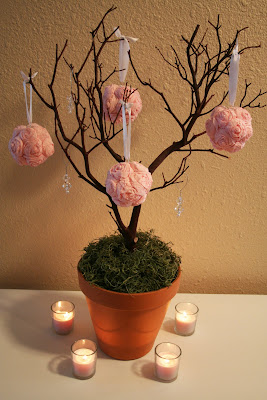 Here's the details: manzanita branch with 4 miniature crepe paper rose pomanders (made with Christmas ornaments I wasn't using) and 4 crystal/pearl hangy things I made in a terra cotta pot (I would paint it brown though, so picture it brown) with moss.